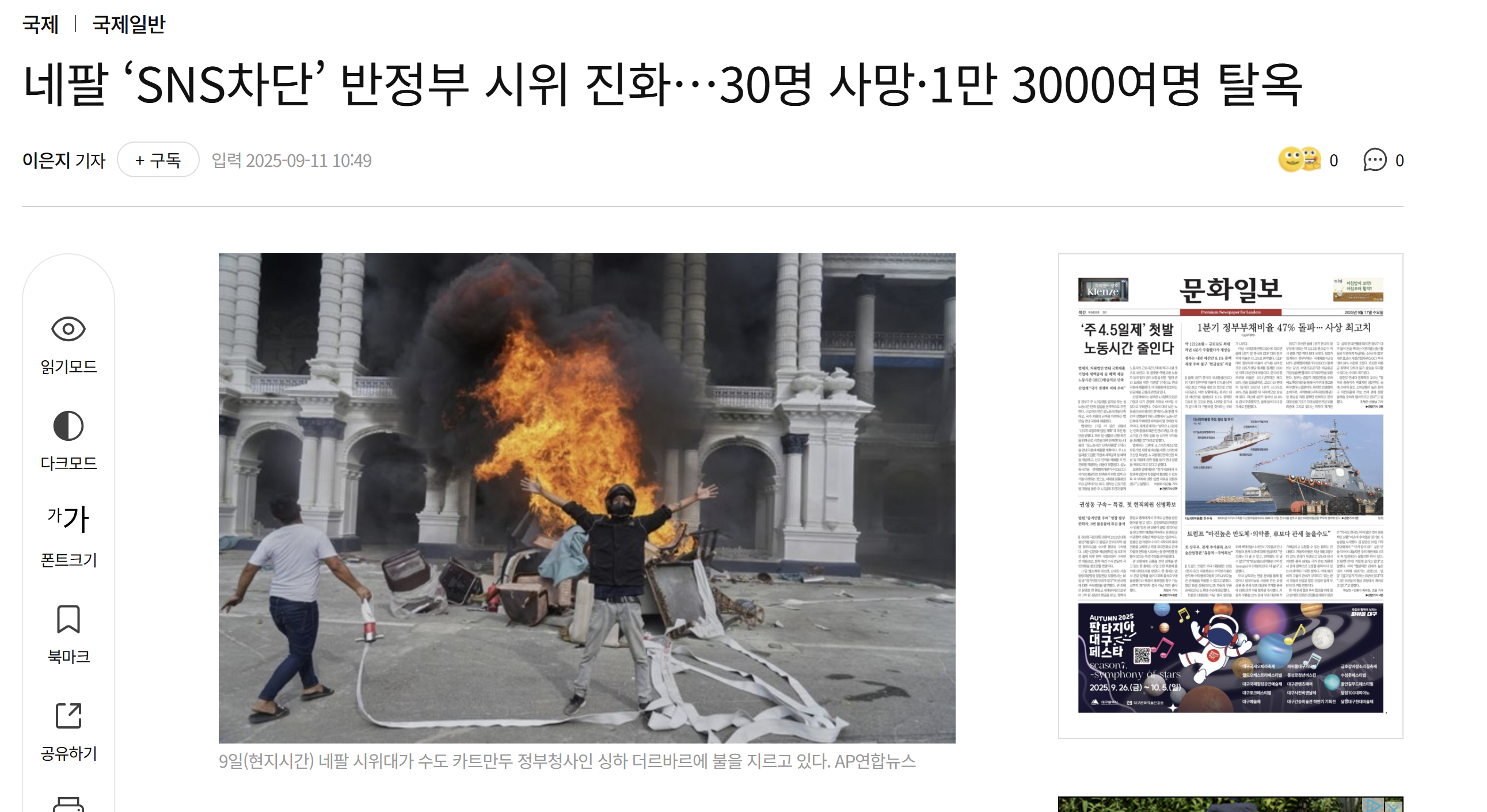 - 네팔 ‘SNS차단’ 반정부 시위 진화 — 문화일보