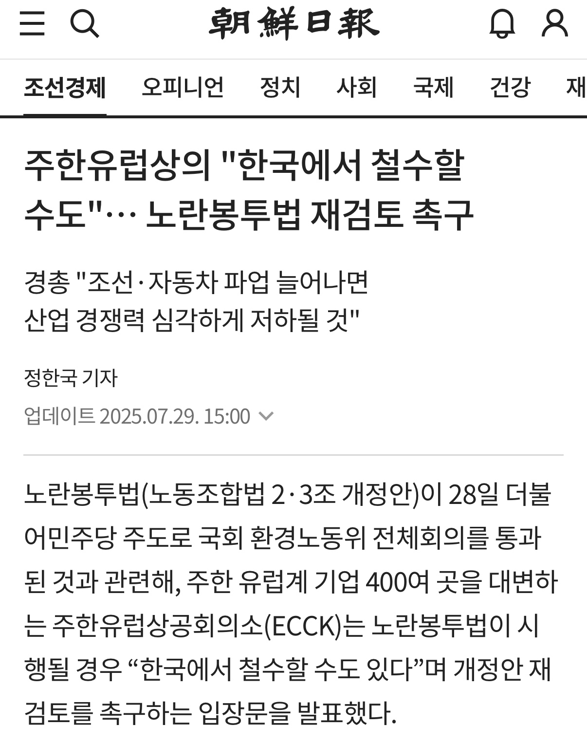 “노란봉투법이 불법행위에 대한 민사책임을 사실상 면제하고, 법적 신뢰성과 예측 가능성을 붕괴시킨다. 법이 이대로 시행된다면, 다수의 유럽 기업이 한국에서 철수하거나 투자를 철회하게 될 것이다.”