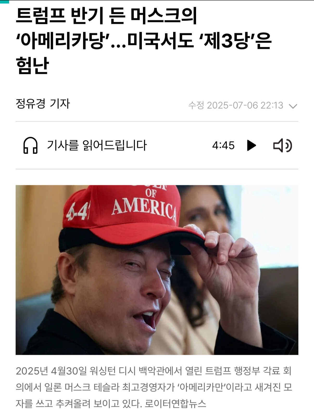 셋째, 이번 창당은 트럼프와의 결별 선언이기도 합니다. 그동안 트럼프를 옹호했던 머스크는, 이번 ‘One Big Beautiful Bill’ 이후에는 정면으로 비판하며 결별했고, 창당은 그 정치적 메시지를 행동으로 보여준 사례입니다.