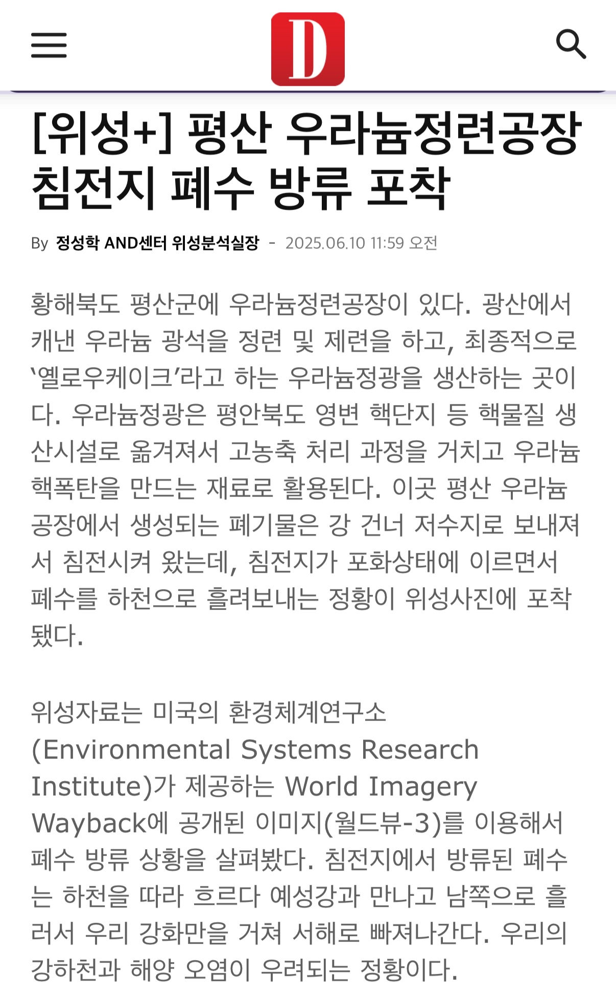 어느 칼럼은 "평산 우라늄공장이 포화 상태에 이르러 하천으로 직접 방류한 정황이 명확히 드렀났다"며 예성 강으로 유입된 팩폐수가 서해와 수도권 식수에까지 파급 될 수 있다고 경고했습니다.