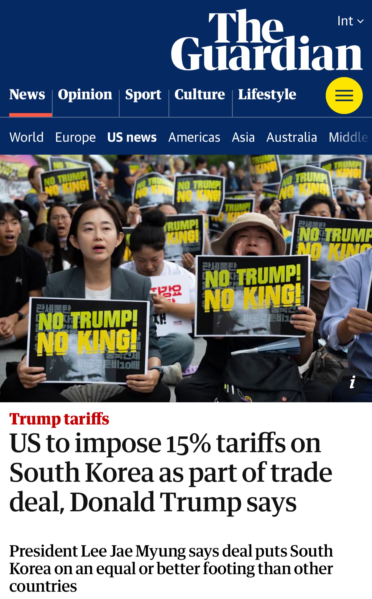 2. US to impose 15% tariffs on South Korea as part of trade deal – The Guardian